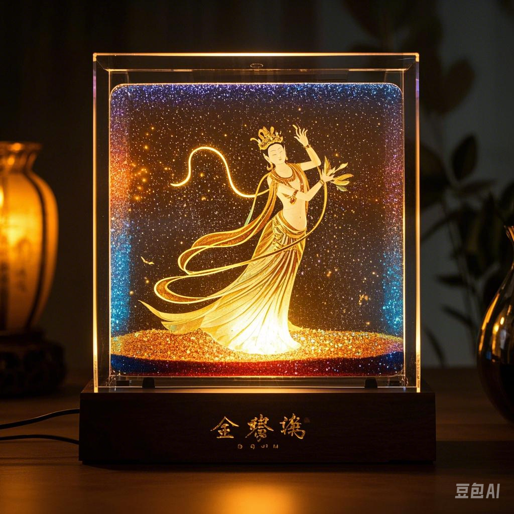 双层亚克力板夹层灌注特制流沙,沙粒含云母粉呈现壁画金箔效果。摇晃时飞天衣袂随流沙重组形态,底部触摸开关可切换敦煌色系灯光(赭石红/青金石蓝)。沙漏设计倒置自动回流,配合《敦煌廿咏》吟唱音效。