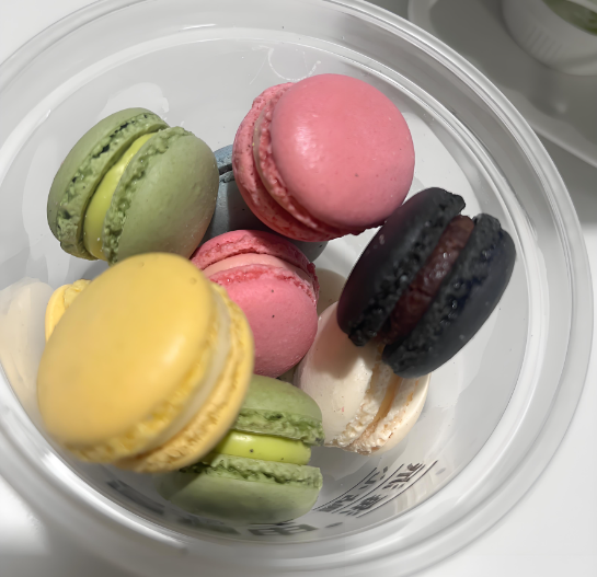 又称作玛卡龙、法式小圆饼,是一种用蛋白、杏仁粉、白砂糖和糖霜制作,并夹有水果酱或奶油的法式甜点。口感丰富,外脆内柔,外观五彩缤纷,精致小巧。