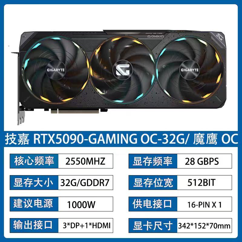 技嘉 RTX5090-GAMING OC-32G/魔鹰OC 核心频率 2550MHZ 显存频率 28 GBPS 显存大小 32G/GDDR7 显存位宽 512BIT 建议电源 1000W 供电接口 16-PINX1 输出接口 3*DP+1*HDMI 显卡尺寸 342*152*70mm
