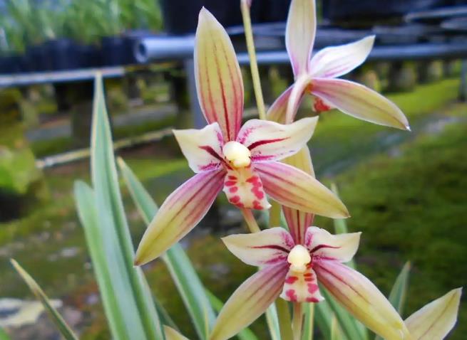 黄金彩虹是建兰的一种,也是入门级的兰花。其花瓣中间有红色条纹,边缘为黄色,在不同光照条件下会呈现不同的颜色变化,故名彩虹。每年都有很多花期,开很多花,往往多箭齐发,每个花箭都有好几朵。花期持续,香味渐远,温度越低,花越红,花香四溢。