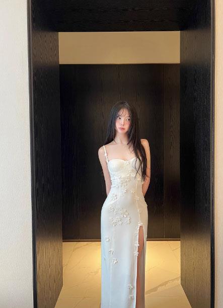 立体花朵连衣裙设计感白色收腰开叉吊带长裙