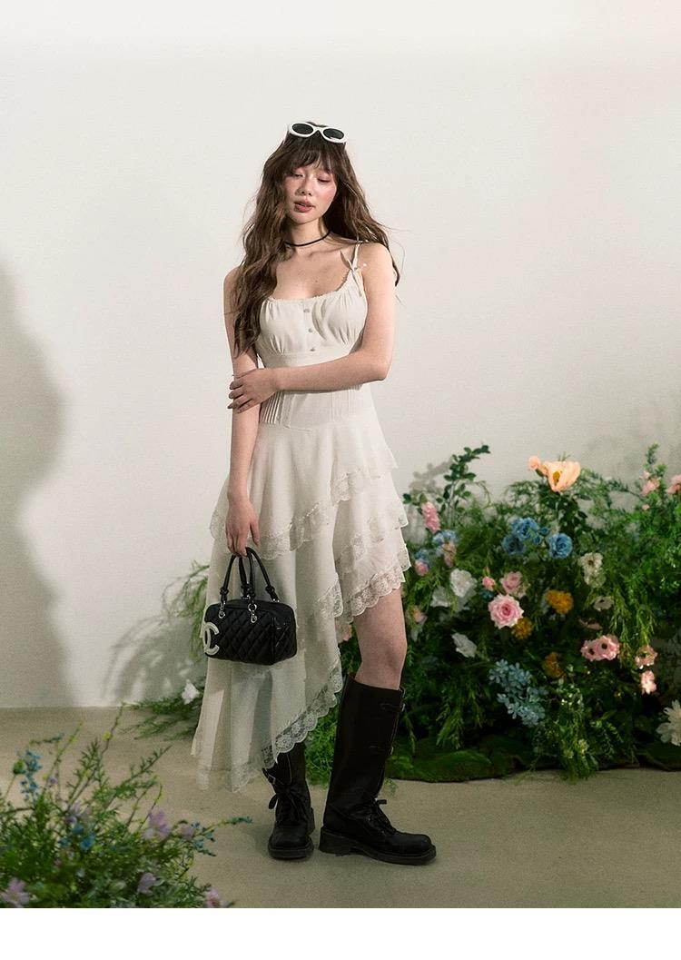 肩带可调节,包容性强。胸口花边拼接,腰部抽牙签条设计,
