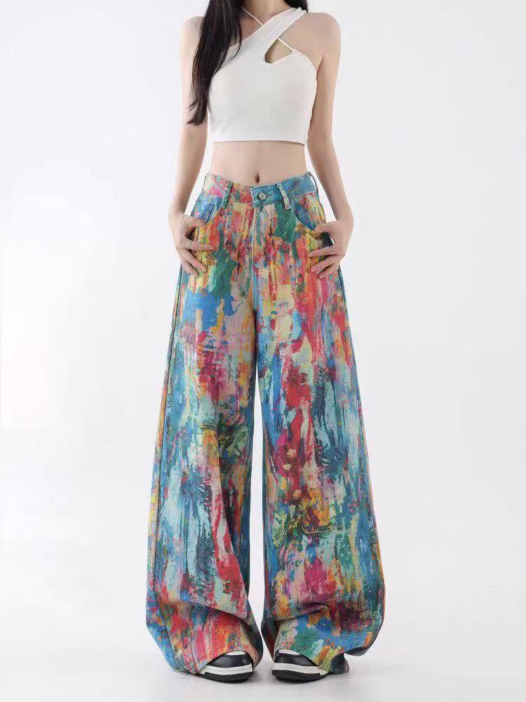 动漫周边 > 服饰 > 彩绘色设计感阔腿牛仔裤女2025新款泼墨油彩盘直 通拖地裤美式潮裤