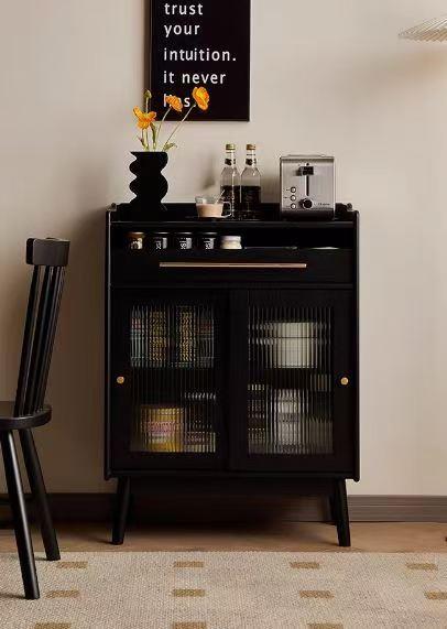 1. 复古腔调:经典黑色柜体+竖纹玻璃门,自带中古韵味 。黄铜拉手、圆润边角细节,复刻旧时光质感,摆在餐厅、客厅,瞬间拉满复古氛围感,适配侘寂风、复古风、混搭风家装。