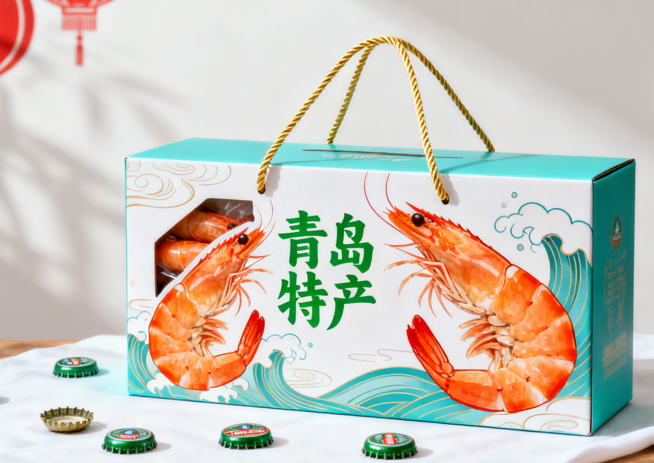 满足大学生 “给家人带特产、节日送同学 / 老师” 的需求,主打 “高端不高价、颜值与品质兼具”,摆脱传统特产 “包装土、价格虚高” 的印象。礼盒含 1.2kg 青岛大虾(单只 30-35g,35-38 只,分 3 盒独立包装,每盒配 1 包调味酱);礼盒设计融入青岛元素(栈桥、海浪插画)+ 大学生创业故事卡片(如 “我们是青岛大学水产专业学生,亲自筛选每一只虾”,增强情感共鸣)。
