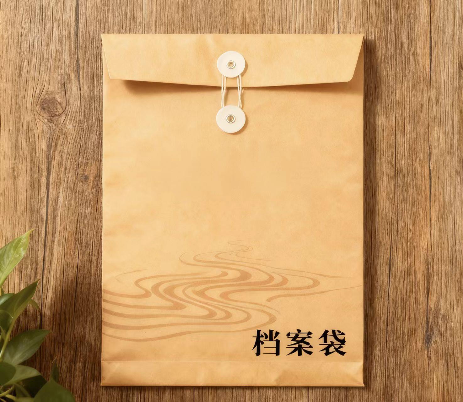 2、材质工艺:选用加厚仿牛皮纸/特种艺术纸,纸张坚韧耐用、不易破损;袋口采用绑带+纽扣式封口设计,密封性较好,便于反复开合与文件收纳。