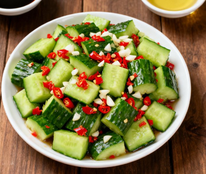 清爽拍黄瓜,新鲜黄瓜拍碎后拌入蒜香与酸辣调味,口感脆爽,是解腻开胃的人气凉菜