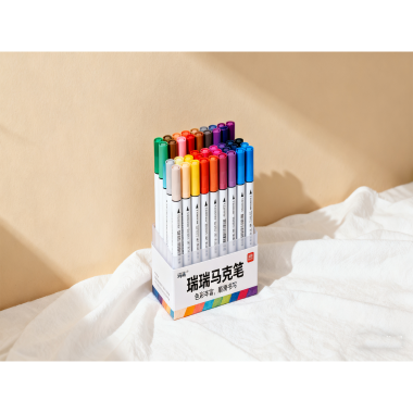 瑞瑞马克笔,专为创意表达而生!笔身印品牌专属水墨 logo,握感舒适易控。采用高品质染料墨水,色彩饱满鲜亮、叠色自然,速干不晕染,防水防刮不易褪色。笔尖双头设计,圆头勾勒细节、斜头大面积涂色,适配绘画创作、手账装饰、办公标记等多场景。多色套装满足不同需求,墨水容量充足耐用,学生、设计师、手账爱好者皆可轻松驾驭,让每一笔创意都精准呈现!