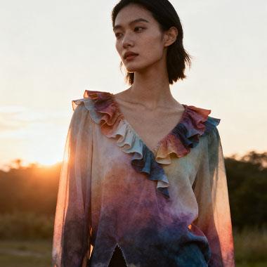 以黄昏晚霞为灵感的渐变晕染,将粉紫、蓝橙的落日色彩揉进轻薄雪纺里,自带朦胧柔焦滤镜。