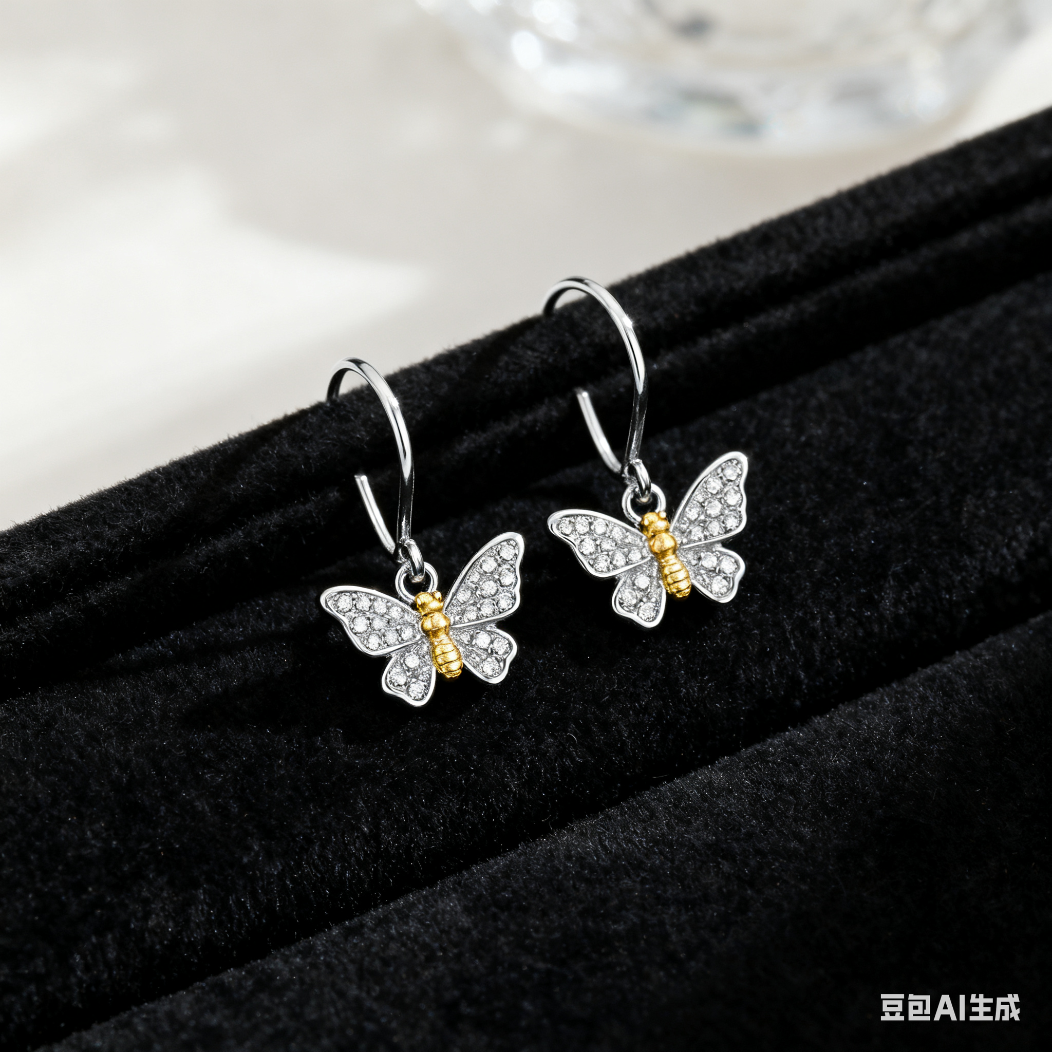 立体蝴蝶造型:以真实蝴蝶振翅瞬间为灵感,采用镂空或浮雕工艺勾勒翅膀轮廓,线条流畅利落,翅膀弧度自然舒展,立体饱满却不厚重,单只蝴蝶尺寸约 1.2-1.8cm,小巧精致,仿佛一只迷你蝴蝶停驻耳际,灵动又俏皮;