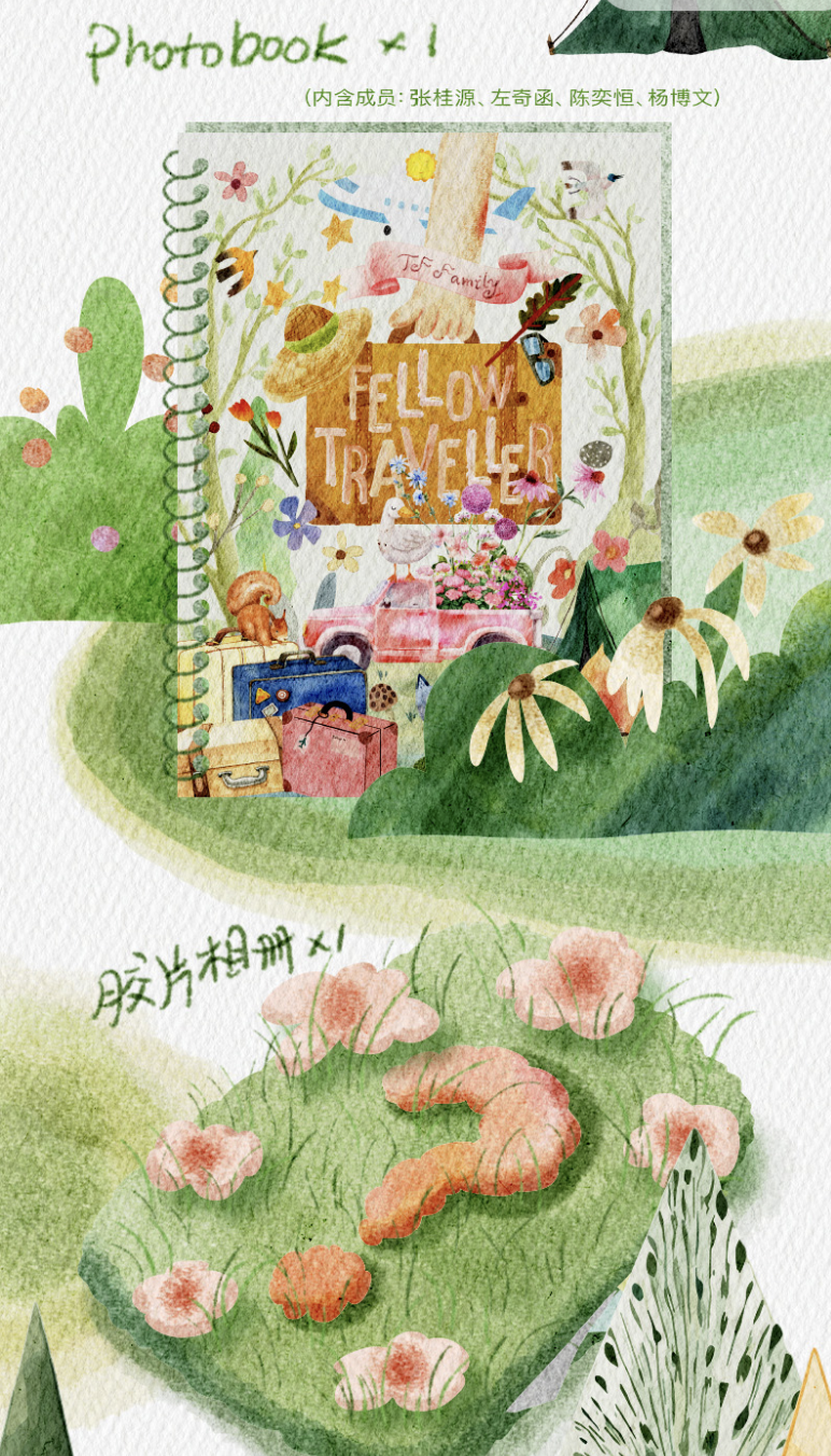 本次TF家族四代《同行 Fellow Traveller》家族款写真套装,售价为119元/套,套装内含:PHOTOBOOK1本,光碟1张、胶片相册1本,明信片7张,手持镜1个、单人小卡1套(4张),合照拍立得2张(18款随机2款),四人合照宝丽来*1张。