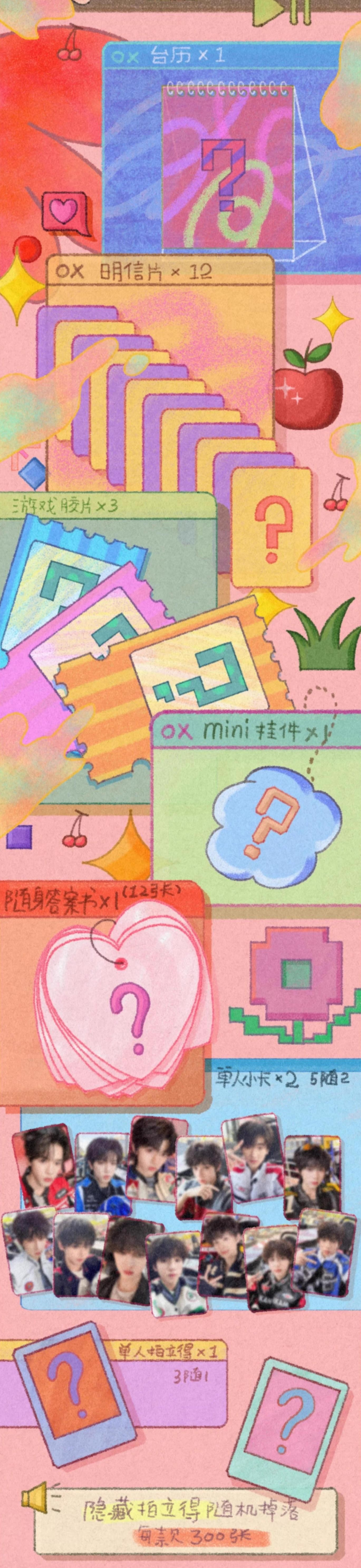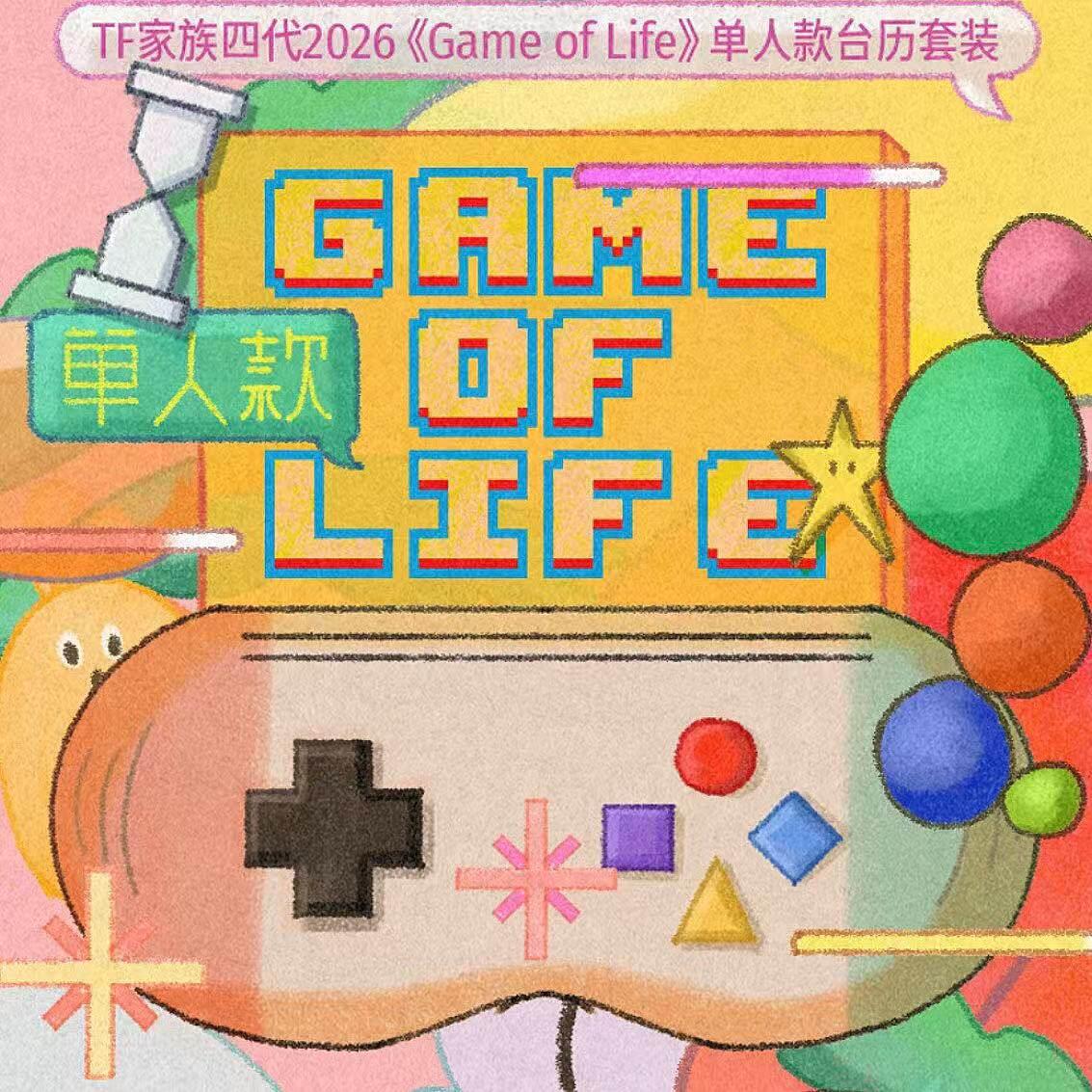 本次TF家族四代2026《Game of Life》单人款台历套装,售价为79元/套,内含:台历1本、明信片12张、游戏胶片3张、mini挂件1个、随身答案之书1份(12页)、单人小卡2张(5款随机2款)、单人拍立得1张(3款随机1款)