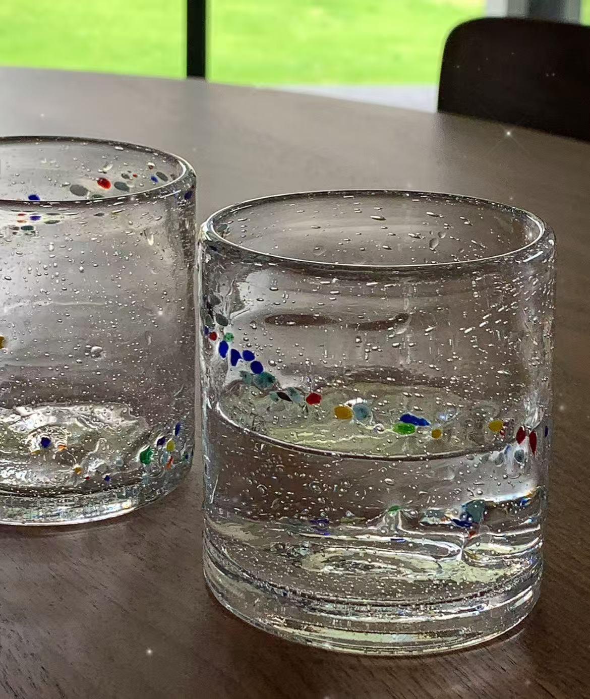 手工吹制的 “快乐星球杯”!透明杯身里藏着彩色碎点和小气泡,每一只的纹路都独一无二,自带专属感。无铅玻璃安全又好洗,装冷饮会让气泡更明显,喝白开水都像在喝 “彩虹汽水”,简约又不撞款~