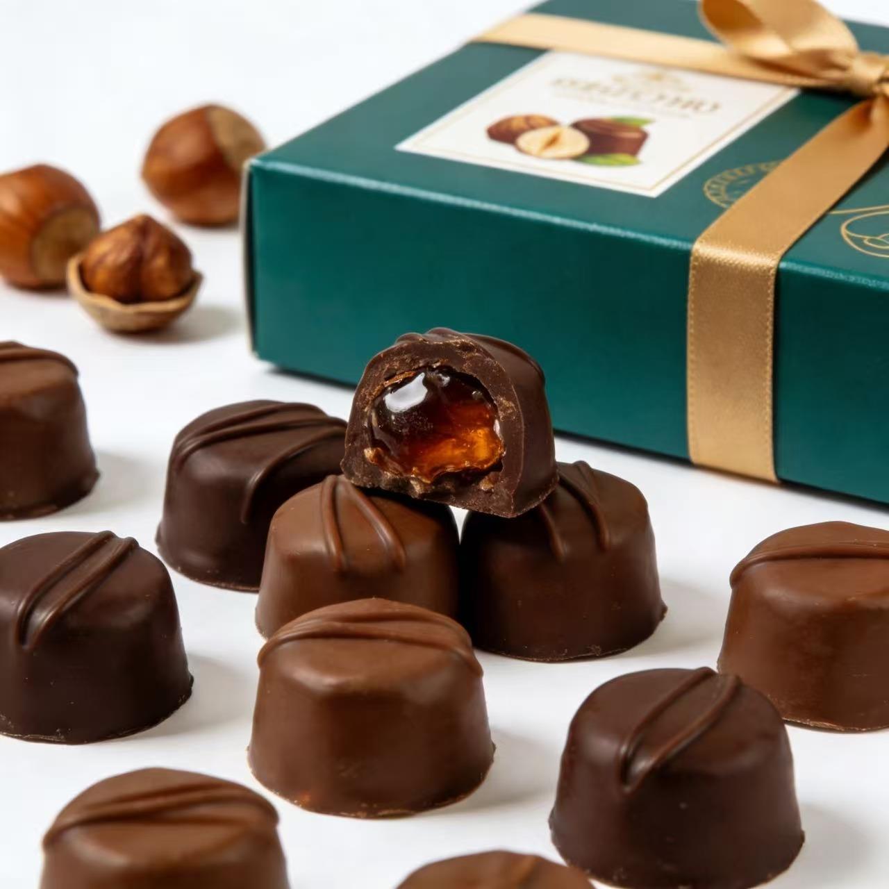 精选朗姆酒、白兰地两款经典洋酒调制酒心,外层是70%纯可可脂黑巧克力,咬开后酒香缓缓释放,酒精含量≤5%,微醺不醉人。