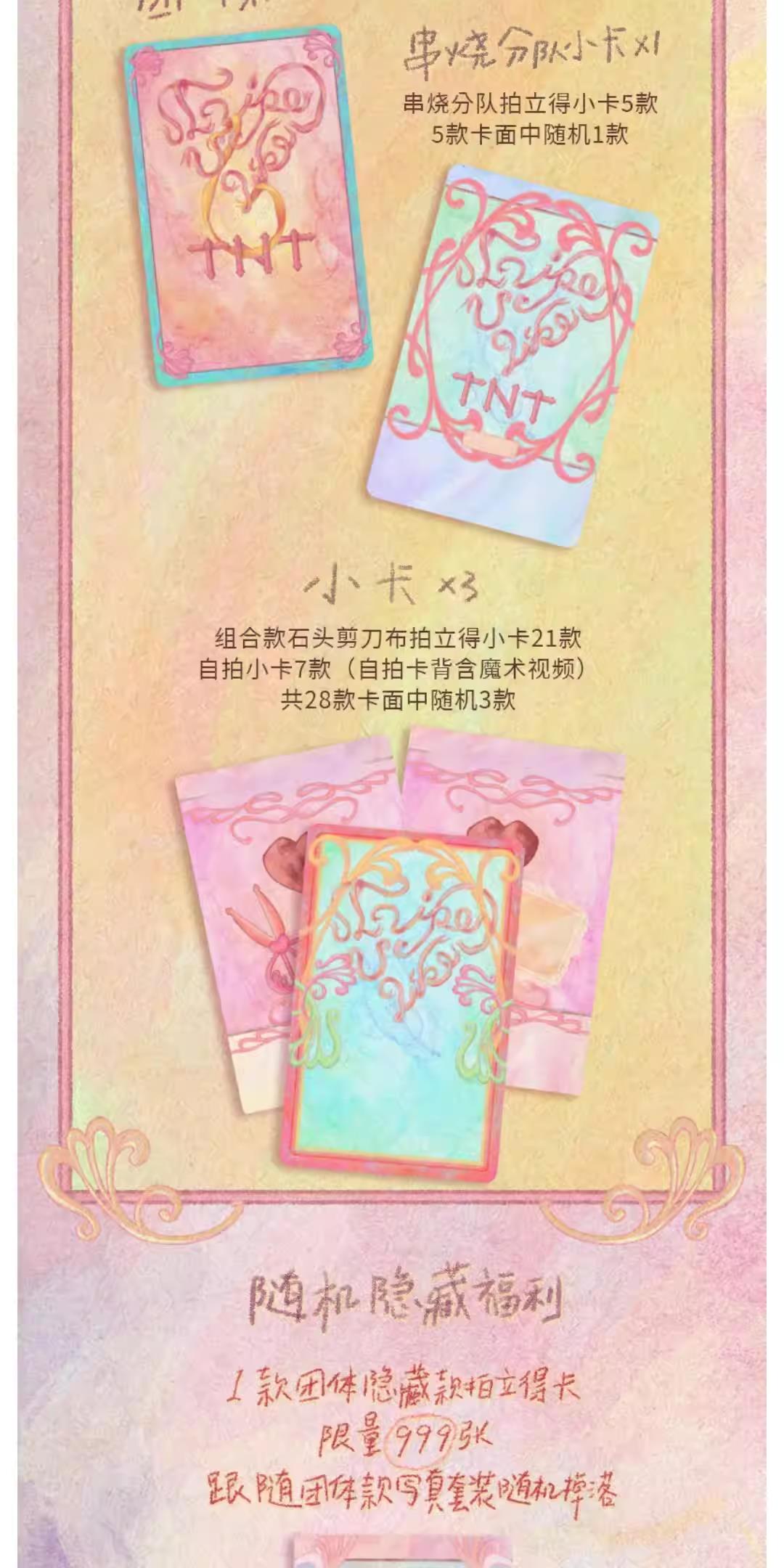 时代少年团出道六周年演唱会「2025•爱你爱我」纪念写真团体款套装,具体样式参考预览图,商品以实际收到为准。请在提交订单前谨慎完整地阅读购买须知,并确保在完全知情并接受本规则的情况下提交订单购买商品,如提交订单,则视为认可并同意本规则的全部内容。本次时代少年团出道六周年演唱会「2025爱你爱我」纪念写真团体款套装,售价为128元/套,内含团体台前幕后全记录PB*1,DVD”1, A4海报“8,PVC扇子*1,成员手绘身份证保护套“1,手机毛绒腕绳“1,团体款小卡”1,串烧分队款小卡“1(串烧分队拍立得小卡5款,5款卡面中随机1款),小卡”3(组合款石头剪刀布拍立得小卡21款/自拍小卡7款(自拍卡背含魔术视频),共28款卡面中随机3款)。1款团体隐藏款拍立得卡,限量999张,跟随团体款写真套装随机掉落。