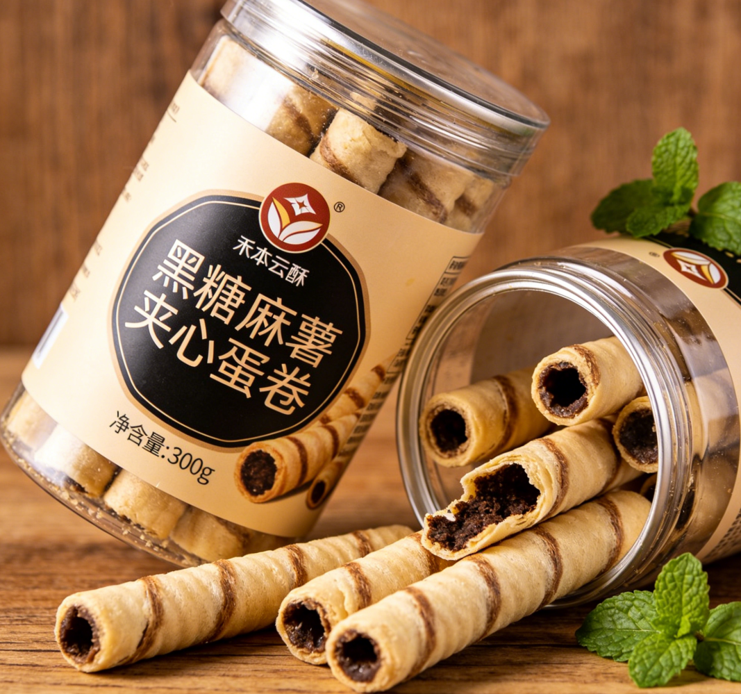 三重口感惊喜!外层是极致酥脆、蛋香浓郁的手工蛋卷,内芯注入软糯Q弹的黑糖麻薯。咬下去先脆后糯,黑糖的焦香缓缓释放。每根独立充氮包装,确保蛋卷不碎、麻薯不干。治愈系甜点,一根解压。