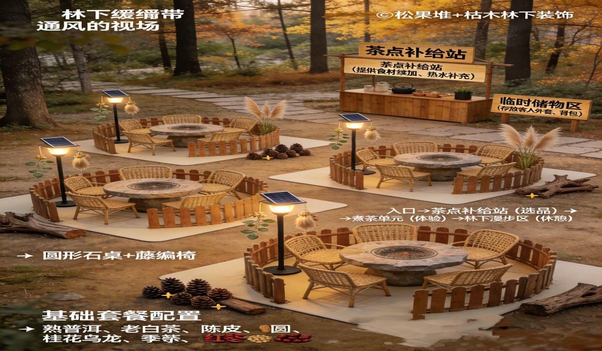 逃离城市喧嚣,赴一场林间围炉煮茶之约!林下专属区域设5-8组煮茶单元,每组标配石桌藤椅与矮木栅栏,茶桌旁点缀太阳能灯与干花,周边散落松果枯木,打造森系氛围感十足的茶歇空间。