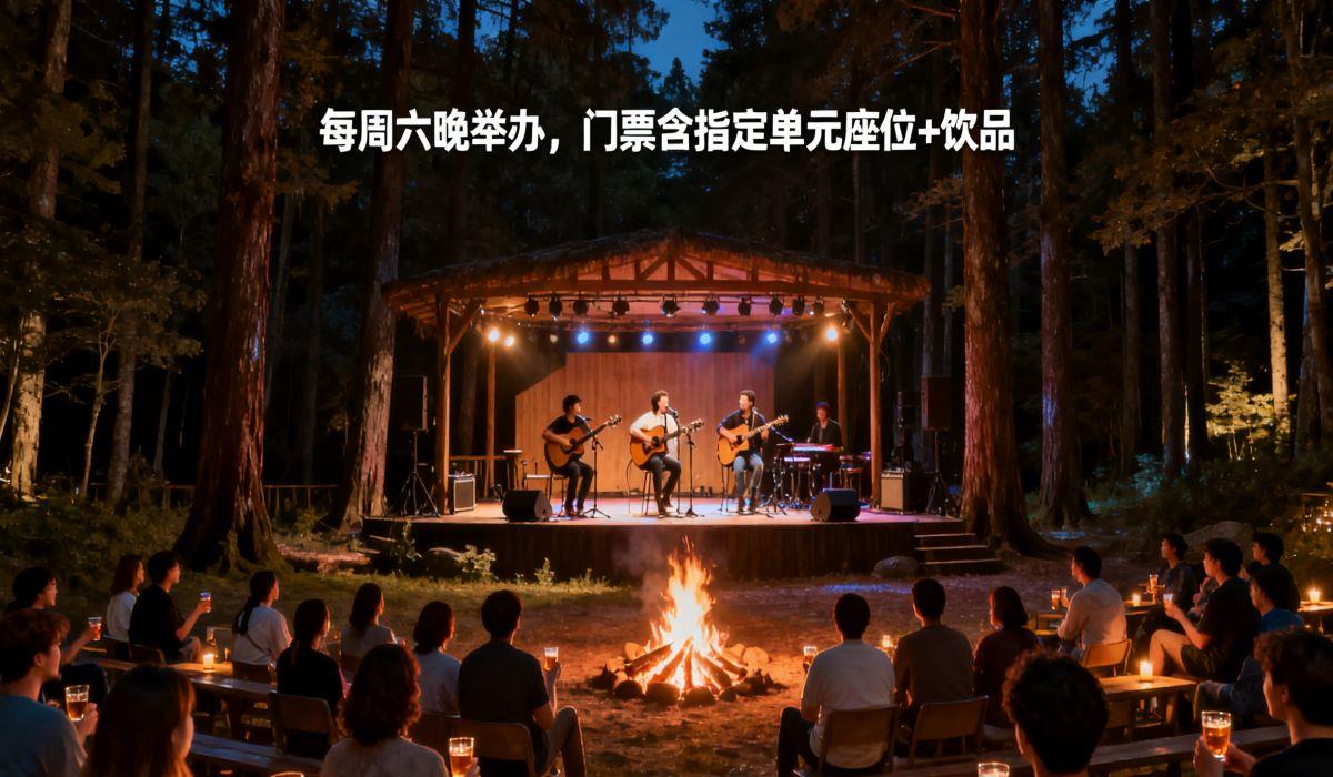 林间音乐节·山野音符之约 逃离城市的钢筋水泥,奔赴一场藏在林间的音乐盛宴!林下小院林间音乐节套餐每周六浪漫启幕,邀你在自然怀抱里邂逅旋律与星光。中央活动区化身沉浸式林间舞台,专业音响与自然声场完美融合,当歌声穿过枝叶、伴着晚风回荡,每一个音符都染上草木的清香。生态火塘旁特设专属观众席,门票直接绑定固定座位,无需早起占位,拎包即可落座,火塘星火摇曳,暖意与惬意一同蔓延。更惊喜的是,每张门票均附赠定制林下饮品——清甜花果茶、清爽草本特调任选,举杯时与身边人相视一笑,耳畔是动人乐章,眼前是星河旷野,这才是周末该有的模样。无论你是音乐爱好者,还是想寻一处放松身心的秘境,这场林间音乐节都能满足你。暂别喧嚣,来这里与自然和音乐撞个满怀