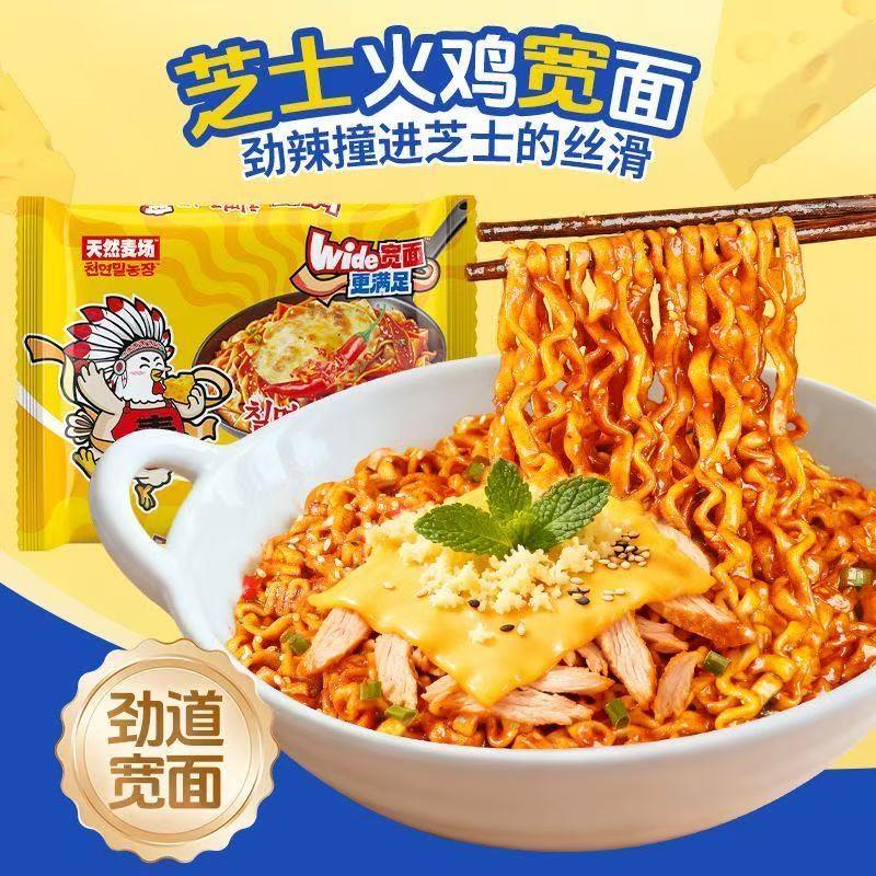 辣中带奶香甜,口感绵密丝滑,芝士味浓郁,辣度比普通火鸡面低,入口柔和,适合怕辣人群。面条Q弹劲道,久煮不烂,裹满酱汁后黏黏糊糊,满足感强37。部分用户反馈,芝士奶香可能带轻微咸味或“奶臭味”,甜味较少715。配料与包装:主要配料包括面饼、复合调味酱包(含芝士成分)、芝士粉包或碎芝士等,部分版本添加欧芹碎提味。净含量常见为140g/袋(单包)或700g/袋(5小袋),包装形式多为袋装,保质期约12个月34。食用方法:简单煮制:开水煮面后沥干,拌入调味包即可;进阶做法可加煎蛋、火腿肠或按米其林主厨创意吃法(如冰火热狗、芝士热狗)提升层次感38。