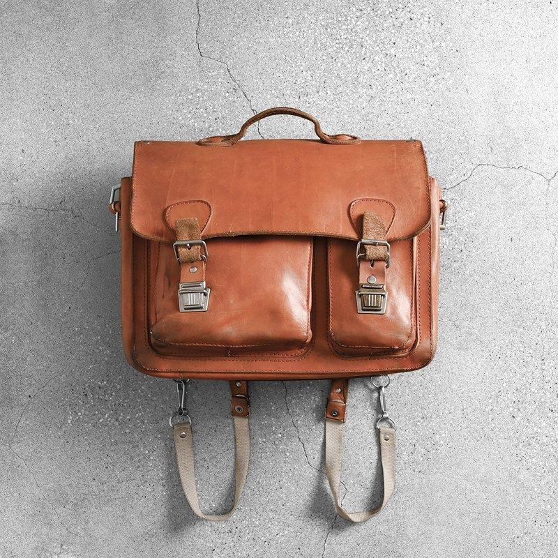 这是一款复古做旧的棕黄色皮质包,属于 “越用越有味道” 的类型 —— 皮革表面的自然褶皱、轻微磨损都是复古感的加分项,双扣翻盖 + 两侧插袋的设计,兼顾了公文包的干练和双肩包的实用性。肩带是帆布拼接皮革,背起来不压肩,既能当手提公文包装笔记本电脑,也能切换成双肩包解放双手,适合喜欢 “美式复古工装风”“阿美咔叽风格” 的通勤党。