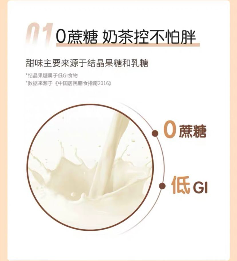 元气森林牛乳茶0蔗糖低脂肪,甜味主要来源于结晶果糖和乳糖;
