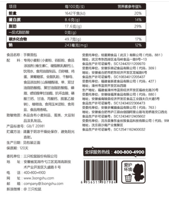 商品名称:三只松鼠面包