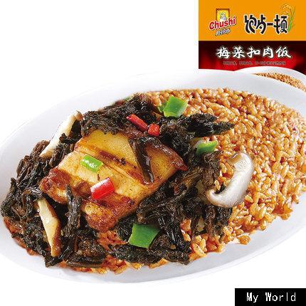 选择五花肉时,是选择肉层黏合密实,是六成肥四成瘦。用连皮烧好后,再在碗里放上腌制的梅干菜。