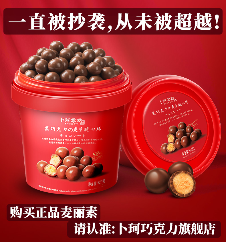 卜珂麦丽素桶装怀旧黑巧克力夹心麦芽脆心球零食年货节糖果送儿童