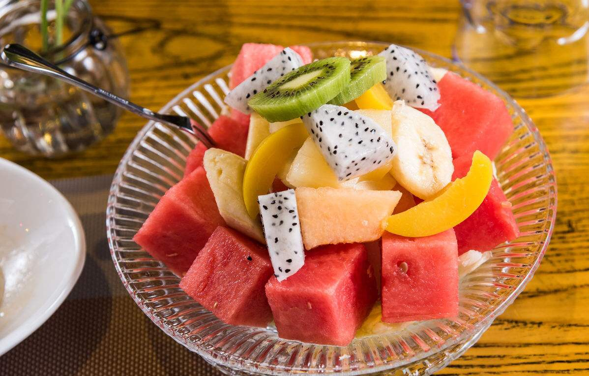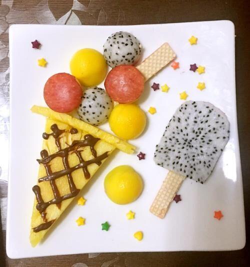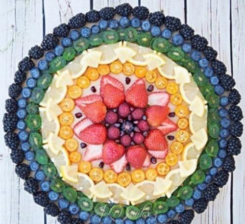 怎样的色、香、味、形、器才能重新将人们的食欲引起?水果的色、香、味是我们所无法改变的,若改变了可能也失去了本身的意义。但我们可以根据想象将各种颜色的水果艺术地搭配成一个整体,通过艳丽的色彩来再次将人们对食物的欲望唤起。水果颜色的搭配一般有“对比色”搭配、“相近色”搭配及“多色”搭配三种。红配绿、黑配白便是标准的对比色搭配;红、黄、橙可算是相近色搭配;红、绿、紫、黑、白可算是丰富的多色搭配。