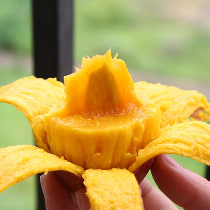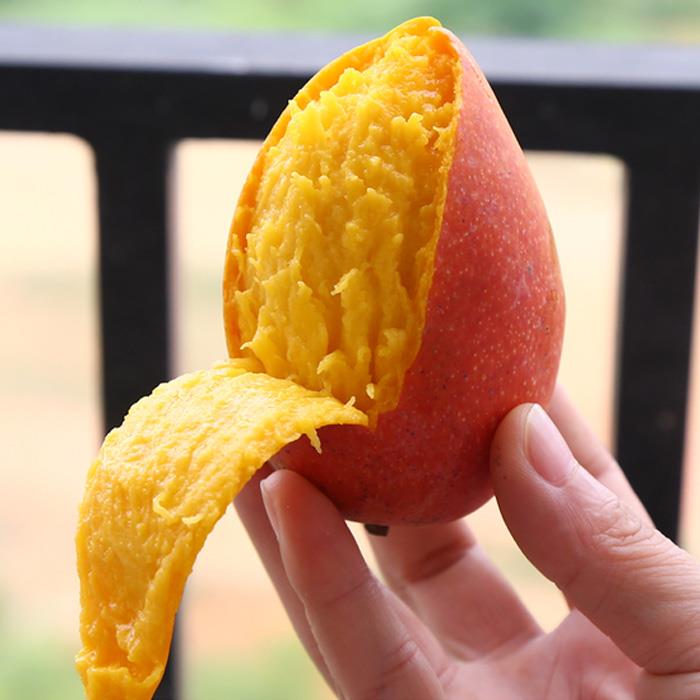 贵妃芒果在我国古代历史上是宫廷贡中最受喜爱的果品,又称其为“ 贵妃 ”。果实长椭圆形,果顶较尖小,果形近似吕宋芒,单果重300-500克。未成熟果紫红色,成熟后底色深黄,盖色鲜红,果皮艳丽吸引人。在收获期天旱而光照充足时,果实较耐贮运,味甜芳香,一般无松香味,糖度14-18度,种子单胚。