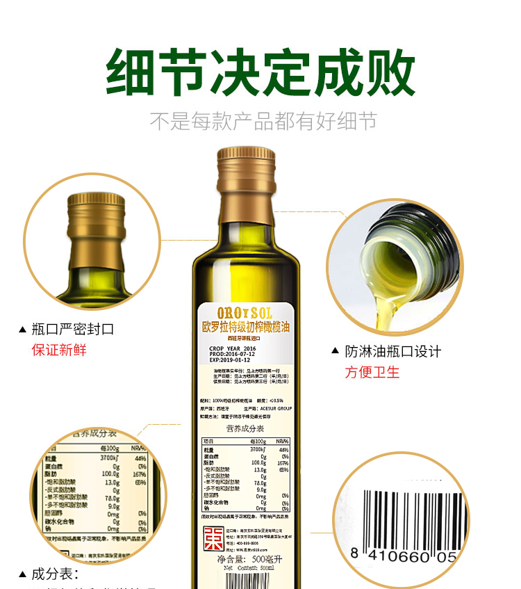 • 配料表: 特级初榨橄榄油      储藏方法: 阴凉密闭保存      保质期: 900天