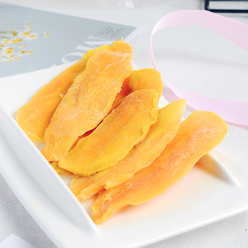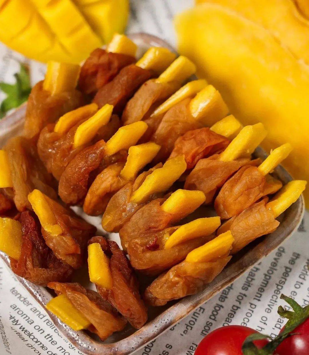 芒果干来自广西,采用的是玉芒这个品种,它肉厚核小,似小台芒般软糯多汁,柔滑香甜,果香非常有“芒果味”!