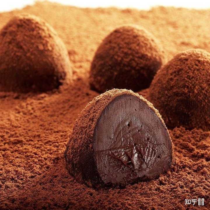 松露巧克力是一种外表沾满可可粉的巧克力,口感细腻香醇,先苦后甜,与其他巧克力相比,松露巧克力先加入淡奶油,使得其口感更加丝滑
