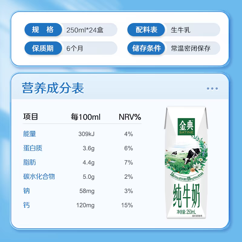 成分。金典纯牛奶由新西兰进口的高品质牛奶制成,每瓶250毫升,含有3.6克蛋白质和120毫克高钙,不含任何添加剂和防腐剂,确保了其天然和纯正的特性。