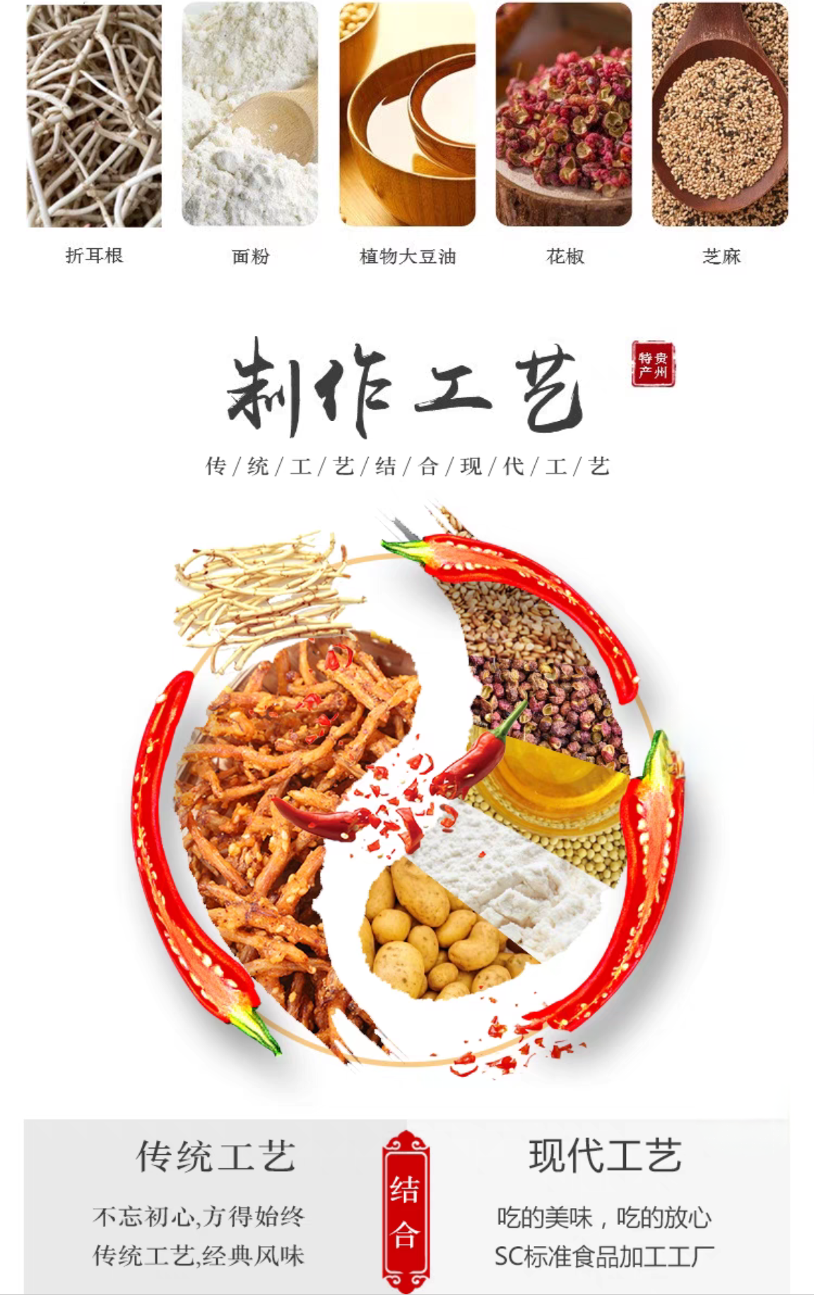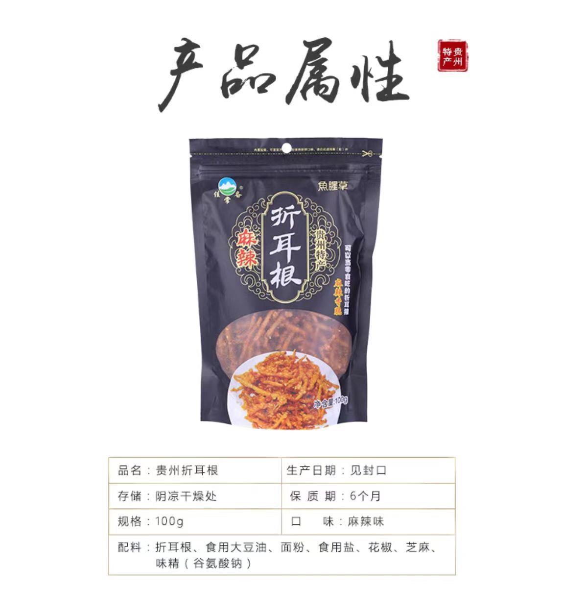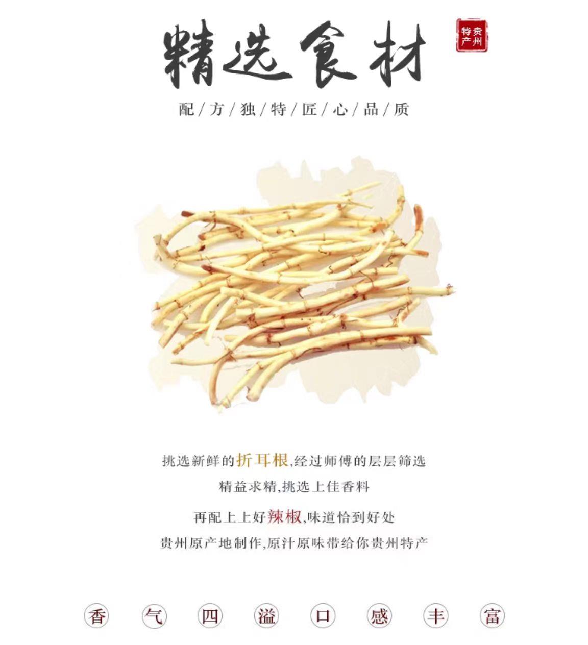 麻辣折耳根是一种贵州特色零食,采用贵州传统美食折耳根(又名鱼腥草)为原料,经过传统手工工艺制作而成,制作过程包括洗净、油炸、沥干、配料、拌料、封装等步骤。食用时,其独特的香味与麻辣味融合一体,口感香脆。它不含防腐剂,具有麻辣香脆的口感,既可作为零食,也可作为配菜。