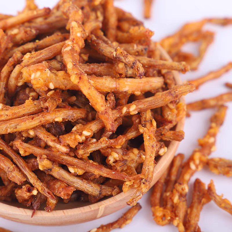 麻辣折耳根的外观通常是小段状的折耳根,表面裹着一层辣椒粉和其他调料,颜色金黄,口感酥脆,具有麻辣的味道。它可以作为零食直接食用,也可以作为配菜与其他食物搭配食用。在食用场景方面,麻辣折耳根通常是在休闲时光、聚会或户外活动时被人们选择的零食之一。它的独特口味和口感也使其成为了贵州特色美食的代表之一,受到了当地人和游客的喜爱。