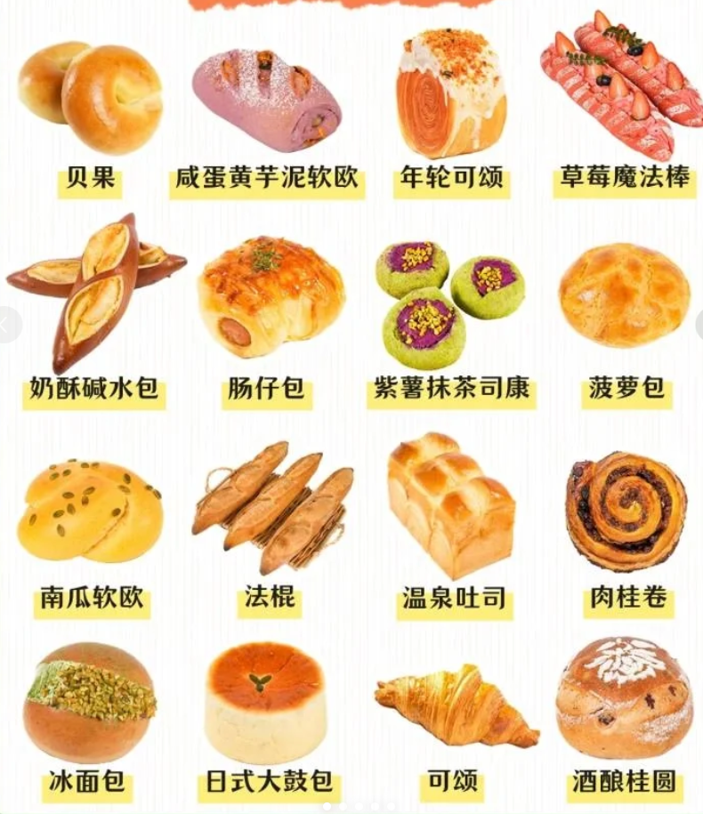 【牛角包】🍘 今日份快乐~牛角包, 平凡的日子,用心记录,今日份快乐牛角包 【盐面包】🍔 每一款面包都是面包人想要表达的情感,好似盐面包, 坚硬的外壳内心却是无比的柔软,咸中又带有一丝回甘! 会不会像正在努力的你呢? 【米面包】🍓 刚刚出炉的米面包配一杯热茶,惬意的下午时光, 在回温的这几天,心情就像吃了糖果一样的好。 【羊角包】🎂 羊角包爆炸好吃 酥脆可口你,层次分明,色泽金黄 堪称元老级别的日式面包,经典的味道值得期待回味。 【芝士鸡扒三明治】🥪 若有心事,吃个芝士鸡扒三明治 吃个面包,包你没烦恼 【杏仁牛角包】🥨 杏仁牛角包外酥里软,表面撒上大颗粒杏仁片 坚果香与麦香、黄油香交织, 牛角包层层软软又有嚼劲,每天新鲜出炉。 【曲奇饼干】🥐 不动脑筋,不藏情绪 就这样慵懒地在咔吱咔吱的声音里 度过整个无所事事的下午吧。 【软欧包】🥮 单有味道而没有颜值的欧包 终究是没有灵魂的!还没开始动刀动叉 大脑里的多巴胺又开始不安分了 【奶香手撕面包】🥖 生牛乳制作,惬意时光 柔软香甜,直接撕着吃的面包 【可颂】🥯 「蜂窝美学教科书」 256层黄油折叠术 今日限定:杏仁流心可颂 酥到掉渣需自备扫帚 【爆浆蒜香奶酪包】🥞 芝士暴击 现熬蒜蓉酱+马苏里拉瀑布 烤箱复热3分钟,香到邻居敲门 【全麦核桃蔓越莓欧包】🥧 吃包也能瘦 全麦核桃蔓越莓欧包 无糖油配方,每口嚼出麦麸颗粒感 健身党早餐救星,饱腹到中午 【酸奶菠萝蜜】🍪 新鲜出炉~,绝对的宝藏级面包 一口下去奶香十足,加上绵软的面包基底 菠萝果肉包裹面包中间,酸甜适中,回味悠长 【火腿可颂】🍩 酥到掉渣的外皮,内里夹杂着彩椒、火腿片、生菜,口感丰富,富有层次 【膳食烤肠堡】🍿 超大一根火山烤肠,被松软面包包裹为一体, 色香味俱全,提升了不一样的层次。 超推荐选它喜欢吃肉肉的买它还会无限回购哟! 【核桃布里奥】🍮 核桃布里奥真的是我尝了在我心中NO.1的新品面包,脆皮表面上沾了核桃碎,脆脆香香,夹心还有奶油,主要是一点都不腻 【芋泥麻薯软欧】🍨 有人会加香精迎合您的味蕾,很抱歉,木讷的我只会食材的味道 【蛋黄肉松麻薯软欧】🧀 不管妈妈怎么说,鸭蛋黄和鸡肉松就是要在一起 【抹茶芋泥全麦米面包】🍯 吃这款包包,请系好安全带,刹车很容易失控 【芋泥蛋黄流心米面包】🌰 就喜欢看你很生气,拿我没辙要爆浆的样子。