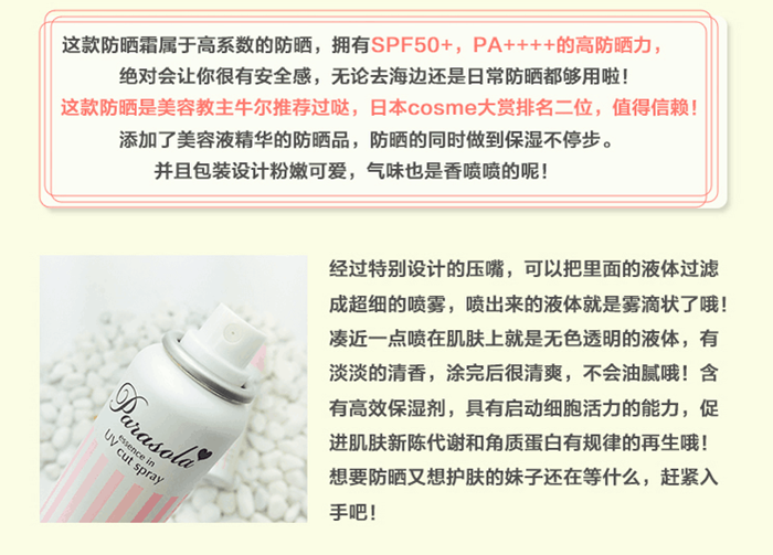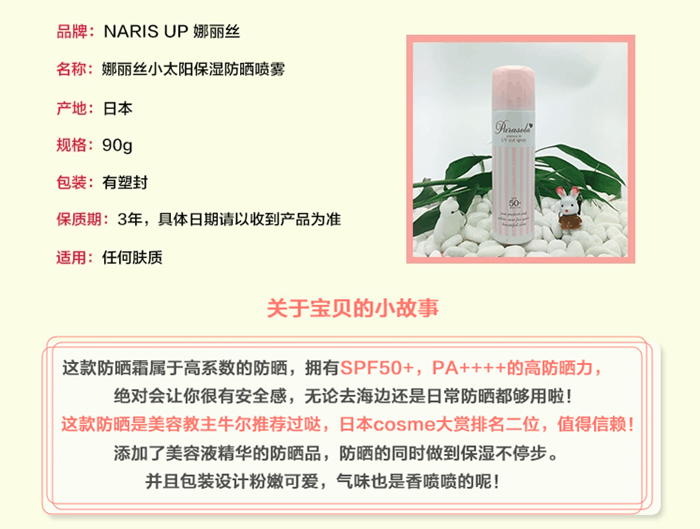 个人化妆、洗发沐浴 > 外貌 > 日本Naris娜丽丝清爽美白隔离防晒霜男女全身防晒喷雾 防水spf50