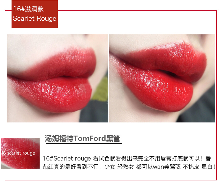 名副其实的贵妇唇膏,保湿、滋润、遮盖力强,对于tom ford而言,唇部是面部整体妆容的焦点,tom ford利用大豆提取物,巴西黄油和洋甘菊花油在内的稀有材料创造出令人难以置信的平滑质地,经过特殊处理的颜色颜料混合出纯净的色彩,黑棕色镶板加金色边缘的华丽造型,同时盖子顶部有TFlogo,底部有色号标签,主打显色、持久,滋润度也是无出其右, 质地非常的奶油,优秀的覆盖唇部颜色。