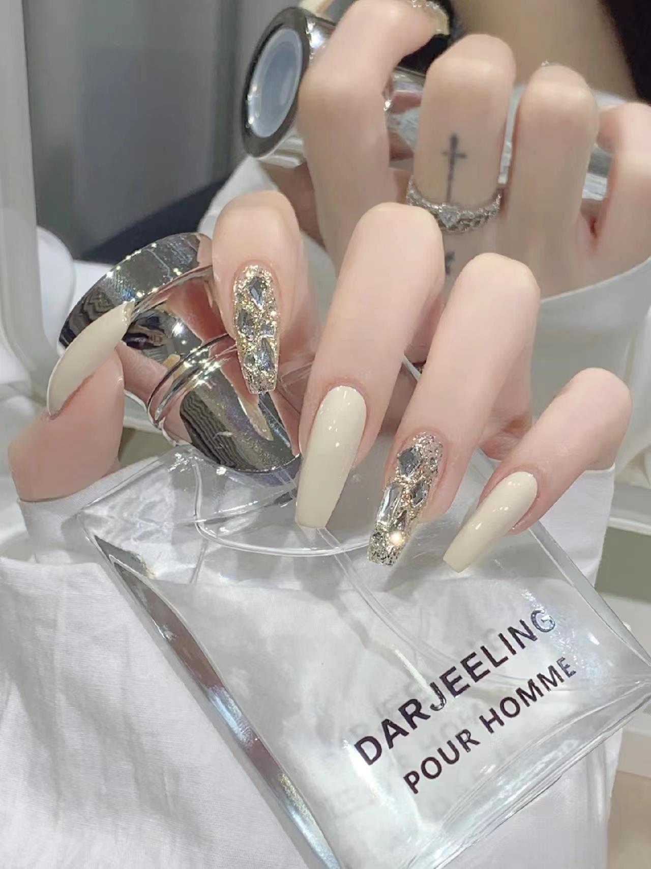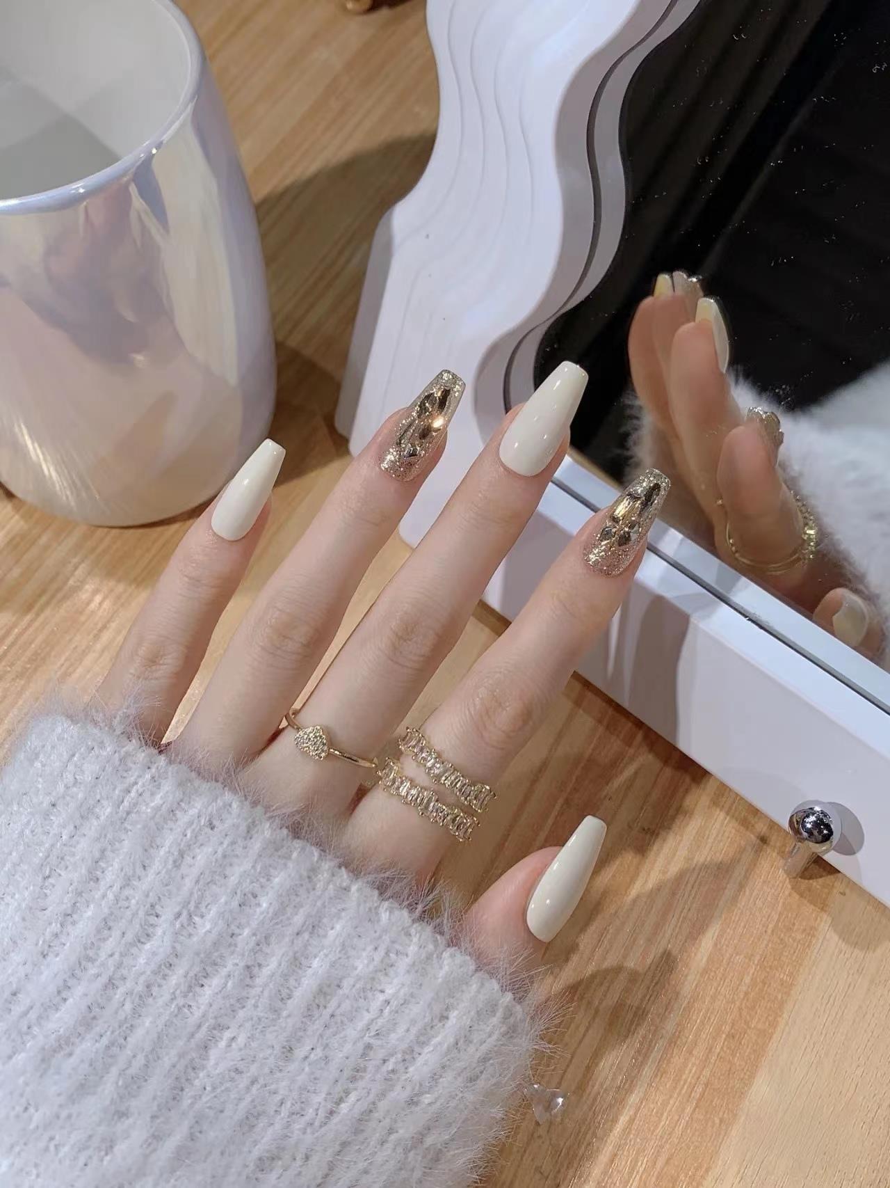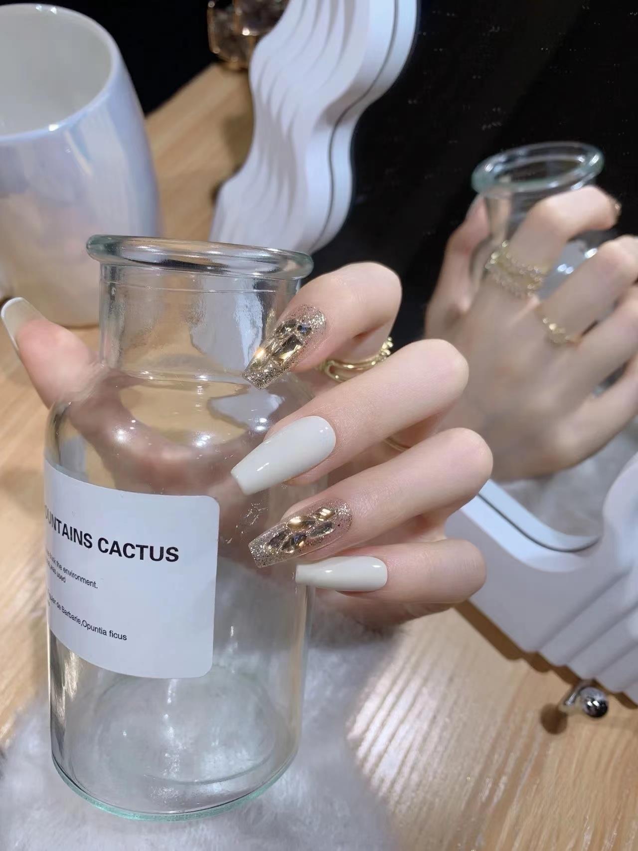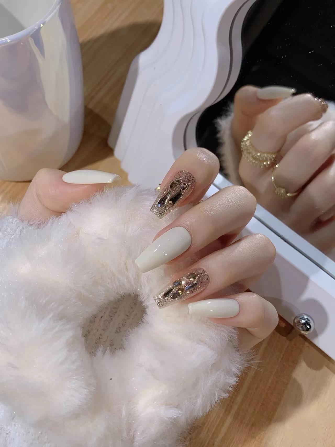 个人化妆、洗发沐浴 > 外貌 > 中长穿戴甲2023年新款手工成品美甲贴片高级感奶白爆闪钻指甲贴片