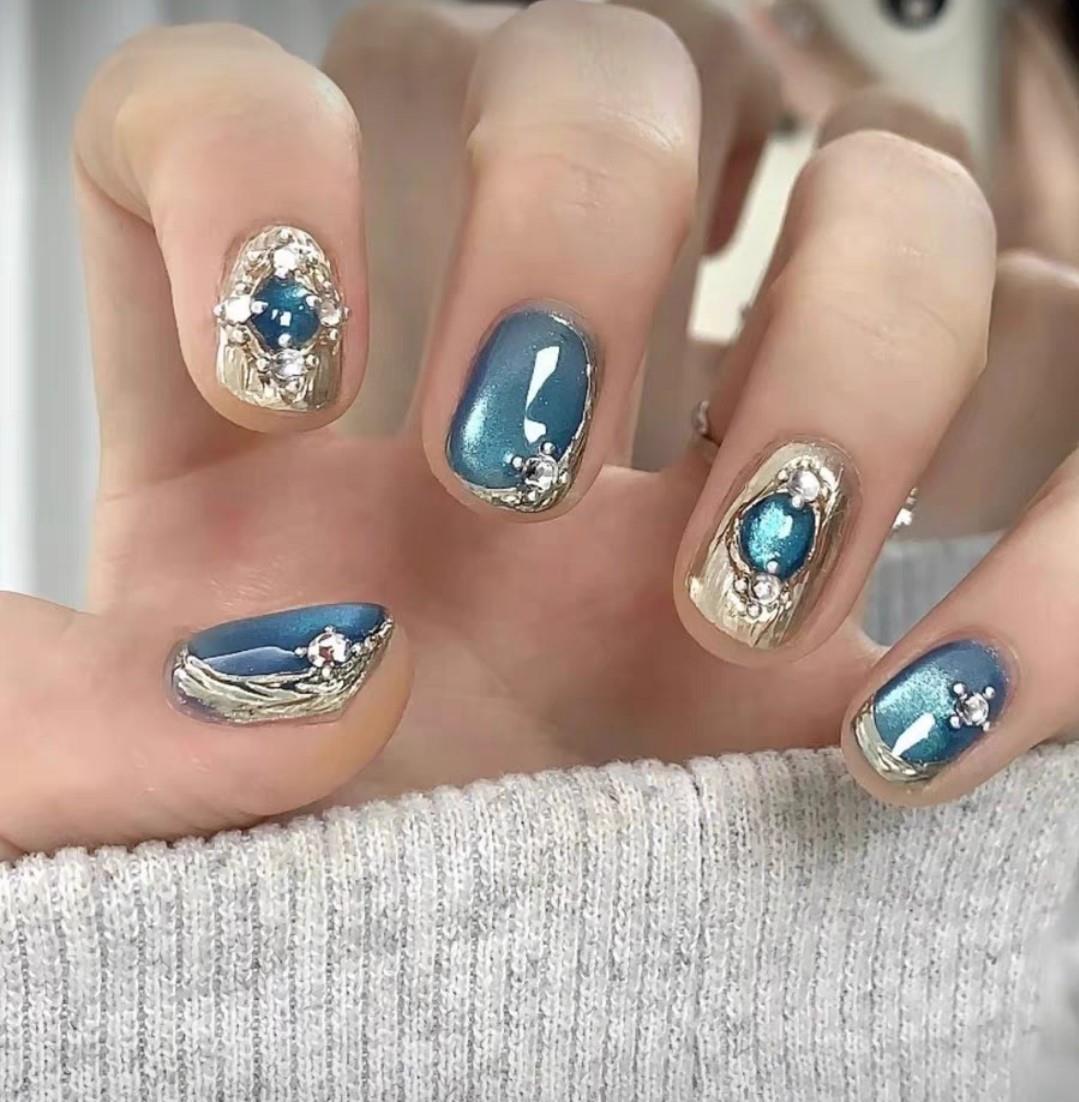 布契拉提玻璃珠蓝色猫眼手工穿戴甲定制美甲