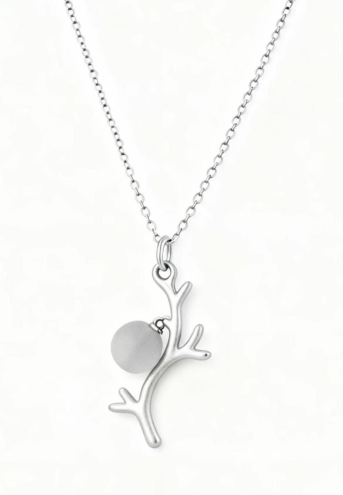 链条选用细款 O 字链设计,通体采用优质镀银材质,表面做了哑光磨砂处理,呈现出柔和不刺眼的银质光泽,佩戴时贴合颈部曲线,勾勒出精致锁骨线条,显瘦又显气质。吊坠部分是立体雕琢的银枝造型,枝桠蜿蜒舒展,边缘打磨得圆润细腻,没有尖锐棱角,触感顺滑亲肤;枝间点缀着几颗小巧的锆石碎钻,光线折射下会透出细碎的微光,低调却不沉闷,日常佩戴不张扬,聚会时又能悄悄提亮造型。