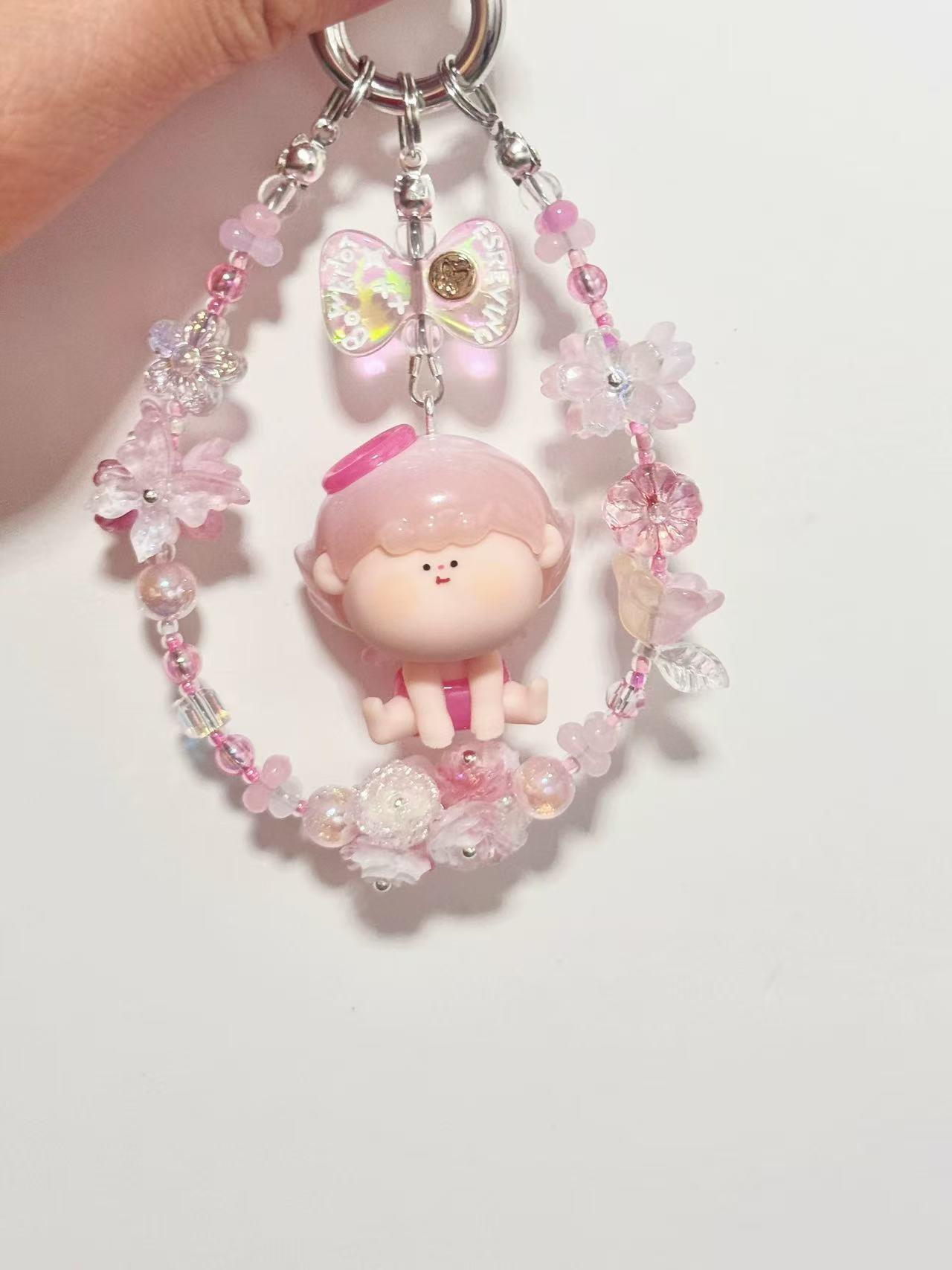 这是一个充满少女心的粉色系挂坠。主体是一个粉色头发、身着粉色服饰的莉莉丝,显得十分俏皮。莉莉丝上方挂着一个带有镭射效果的蝴蝶结装饰,上面还有文字标识。围绕着卡通小人的是一圈由粉色珠子、透明花朵状珠子和其他装饰性珠子串成的链子 ,整体造型精致甜美,非常适合用来装饰包包、钥匙等物品,能为日常用品增添一份可爱气息。