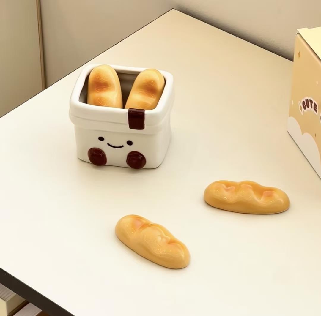 里面装的 “面包” 全是立体陶瓷筷架:每只都带着面包的自然纹理 + 渐变烤色,既能架筷子,也能单独当小碟托,摆在桌上像刚出炉的面包堆,吃饭都变香啦!
