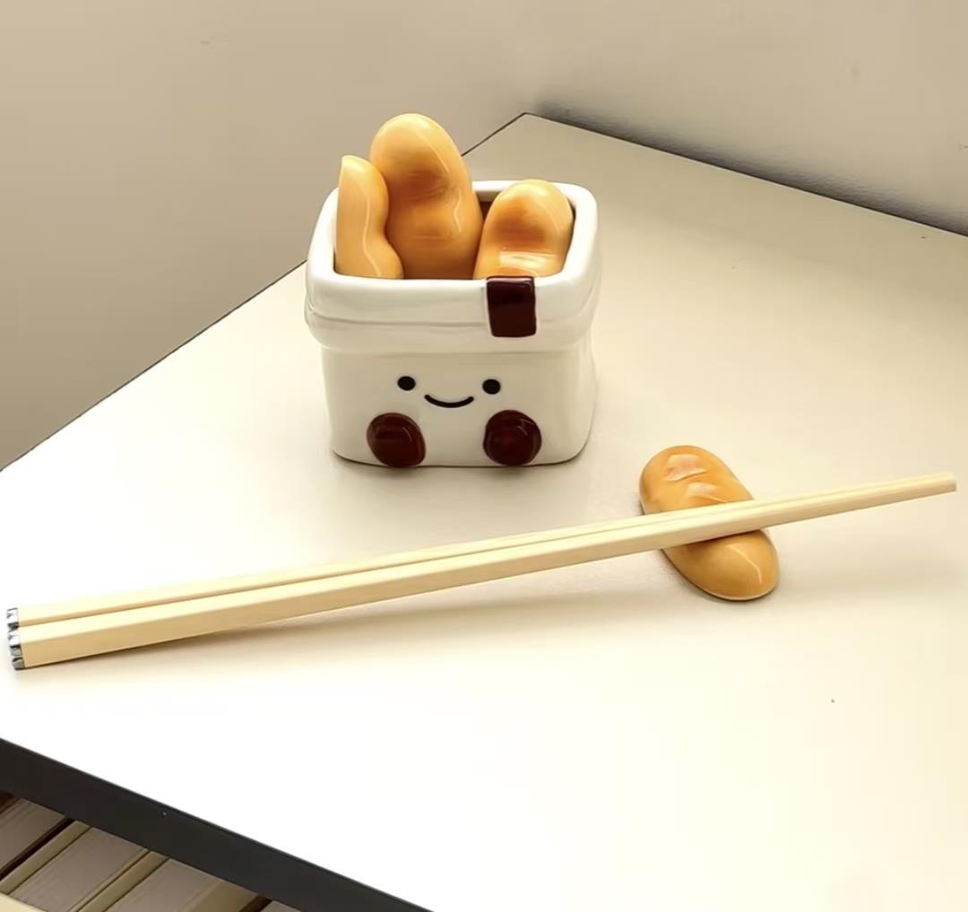 吃饭时把筷子架在 “面包” 上,连夹菜都像在 “偷面包”,可爱到想多吃两碗饭!收纳盒还能把筷架收得整整齐齐,厨房都变治愈了~