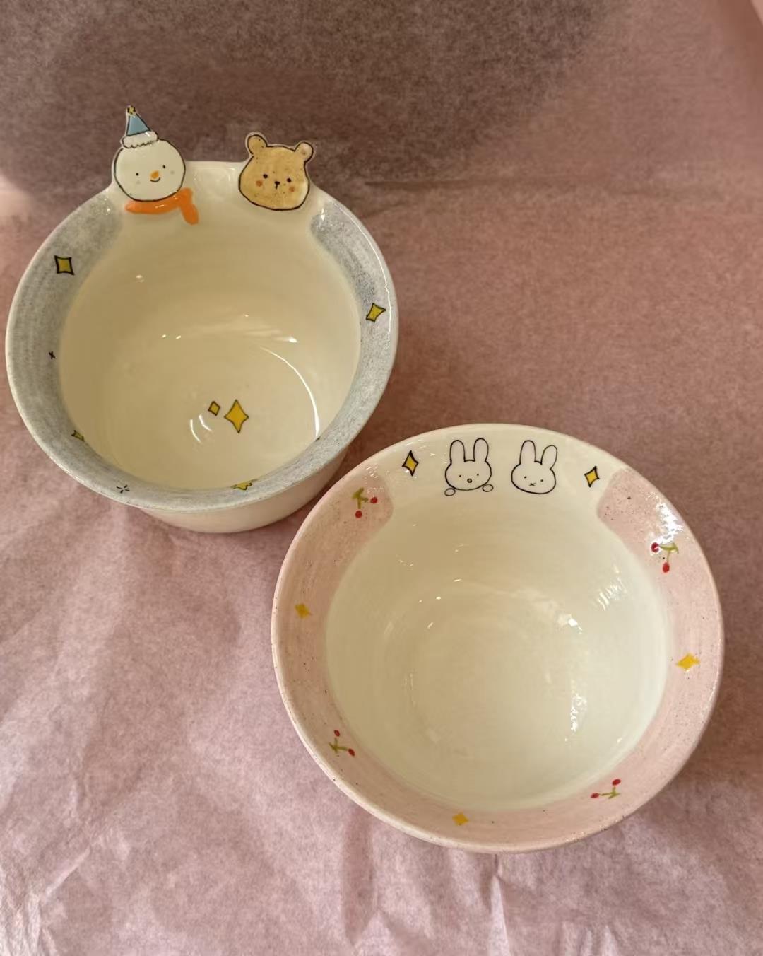 谁能拒绝 “一整桌萌友” 陪你吃饭?这对是手作粗陶 + 立体萌物装饰的 CP 款 —— 碗身带着细腻的颗粒质感,一个是浅灰 “冬日款”,一个是粉糯 “甜系款”,摆在桌上像凑在一起的小派对~