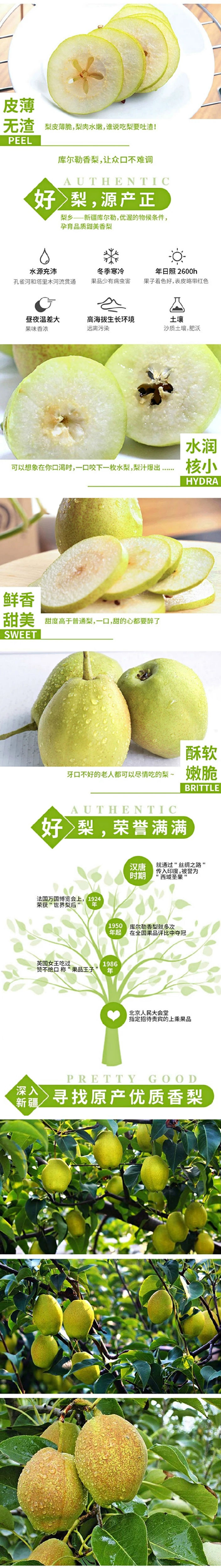 库尔勒香梨有色泽悦目、味甜爽滑、香气浓郁、皮薄肉细、酥脆爽口、汁多渣少、落地即碎、入口即化、耐久贮藏、营养丰富等特点,被誉为“梨中珍品”、“果中王子”。
