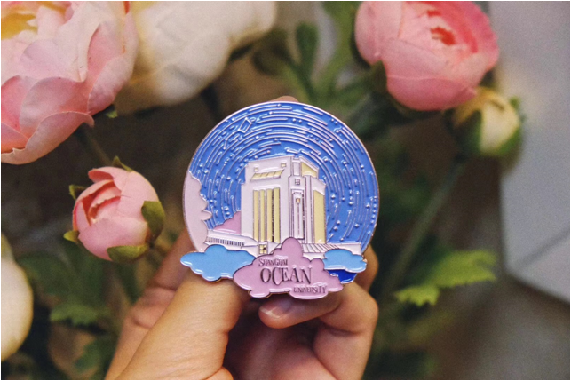 图书馆是我校最具标志性的建筑之一,作为知识的象征,屹立在海大校园的中心。每天都有莘莘学子于此间来往,在馆内攻克学业上的各种难关,直到十点闭馆,都能看到温馨的灯光在临港的夜空中照耀着。我们希望把这一个意向带到徽章当中,让在读的学生能获得无尽的动力,毕业后的学子也得以将那段艰苦而充实的岁月找到一个寄托