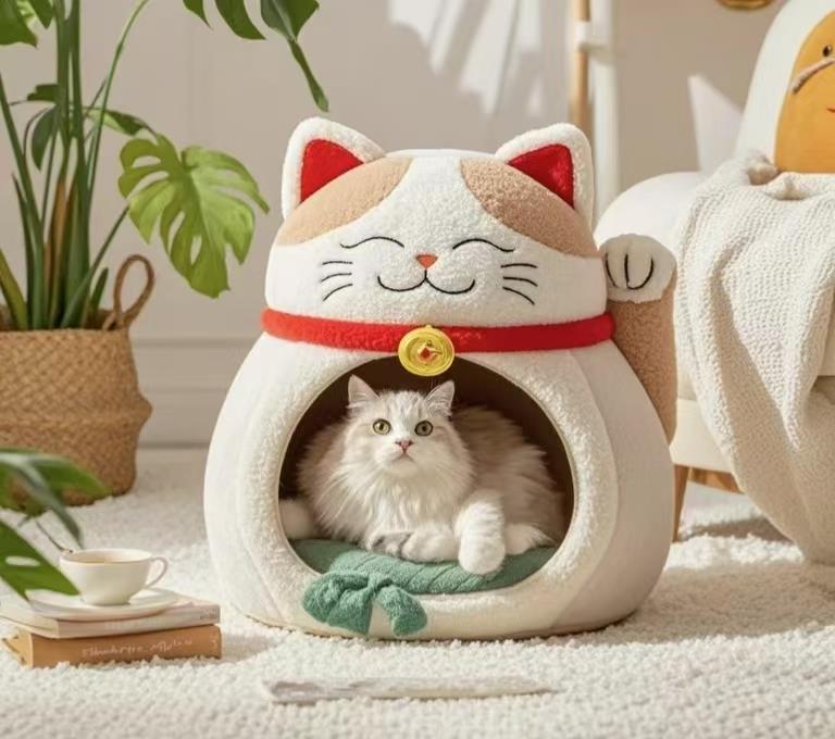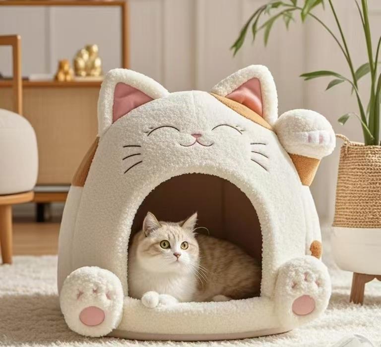 外观小猫形状,半封闭造型,好睡又好玩,方便宠物进出。毛绒材质触感极佳,高填充立体棉花,不易塌陷弹性良好,光滑细腻不易粘毛,干净易清洁,深受宠物喜爱,冬季能惬意蜷缩其中。透气性良好,夏季也能保持舒适度。底部有防滑,防止小窝移动。