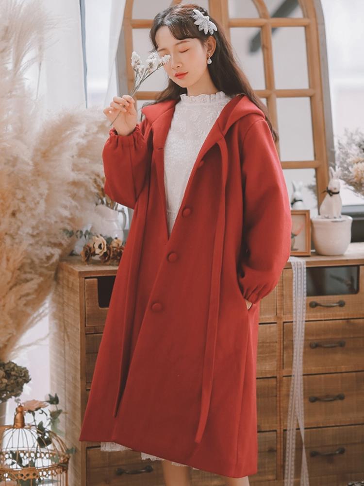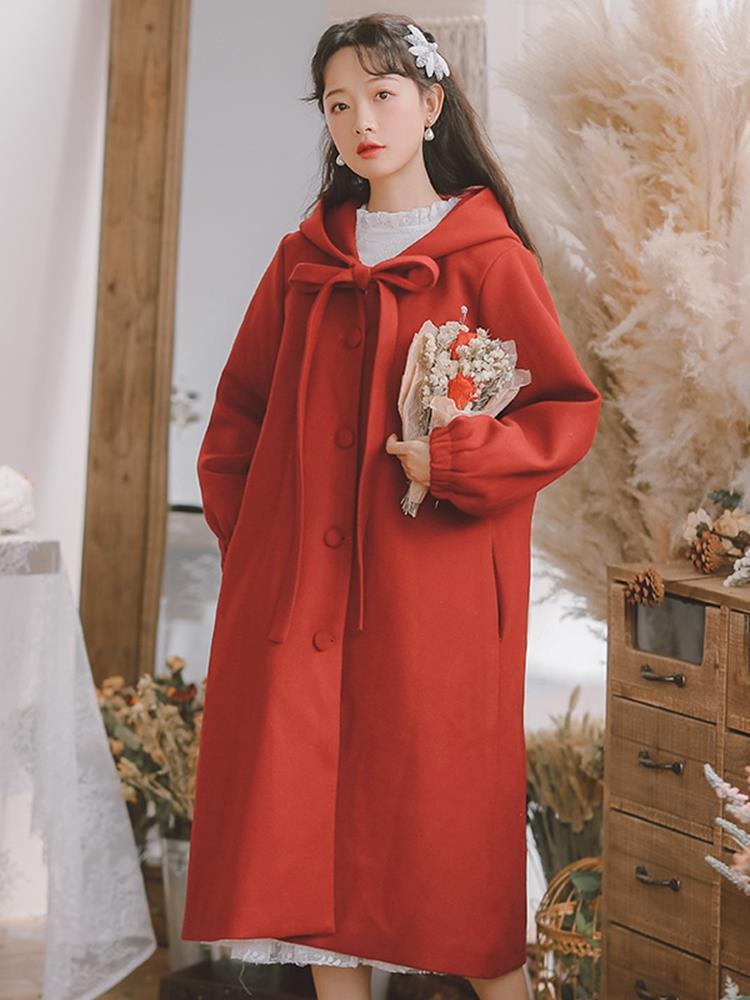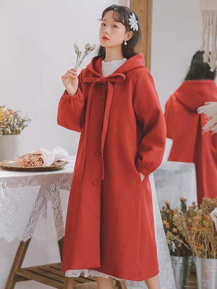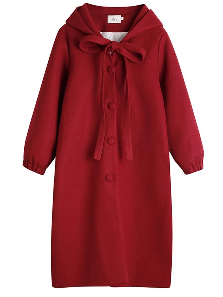 细致柔软的毛呢面料,连帽领设计,单排手工包扣,领口蝴蝶结系带设计。